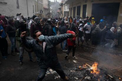 Un manifestante arroja piedras a la policía durante las protestas contra el fin de los subsidios a combustibles anunciados por el presidente Lenin Moreno. El gobierno calificó las manifestaciones como un intento de golpe de estado. Moreno dice que el ex-presidente Rafael Correa y el presidente de Venezuela, Nicolás Maduro, están detrás de ello. Crédito: Getty Images/Getty Images